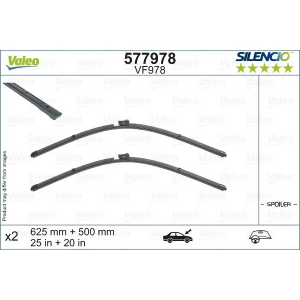 Pióra wycieraczek przód Valeo Silencio Flat VF978 (2 szt) do Audi A6 Avant C8 kombi zawiera zintegrowane dysze spryskiwaczy (2018, 2019, 2020, 2021, 2022, 2023, 2024, 2025). Producent: Valeo. Długość: Lewa - 625 mm, Prawa - 500 mm. Zawartość: 2 szt. Miejsce montażu: Pióra wycieraczek przód.