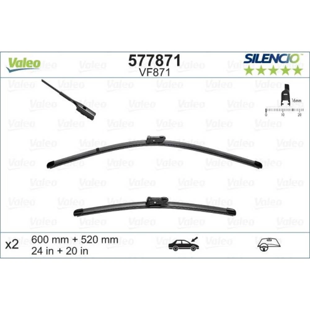 Pióra wycieraczek przód Valeo Silencio Flat VF871 (2 szt) do Audi Q3 8U SUV (2011, 2012, 2013, 2014, 2015, 2016, 2017, 2018). Producent: Valeo. Długość: Lewa - 600 mm, Prawa - 520 mm. Zawartość: 2 szt. Miejsce montażu: Pióra wycieraczek przód.